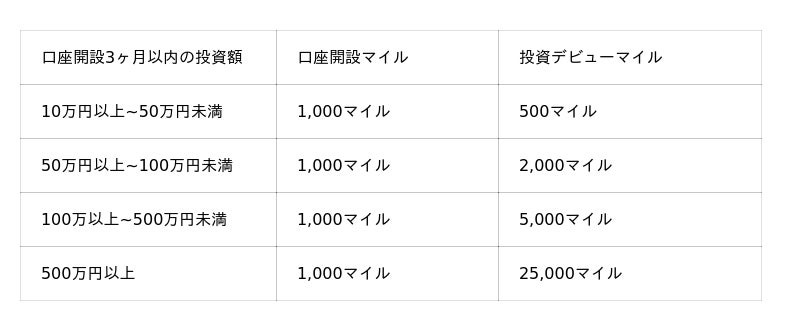 新規口座開設完了日から3ヶ月以内に、累計10万円以上の投資を行っていただいた方に、投資額に応じて以下のマイルを積算いたします。