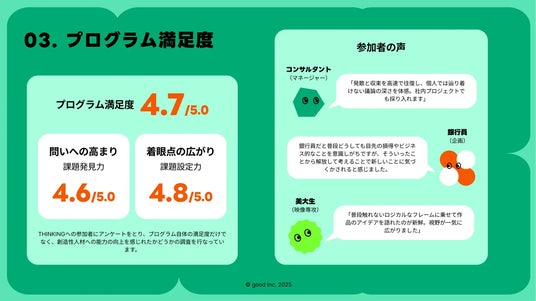 THINKINGは、good Inc.の自社事業(社会実装事業)の一つとして位置づけられており、「着眼点」「問い力」「課題設定力」の3つを中心に、人と組織の"思考の質"そのものを鍛えることを目的としています。