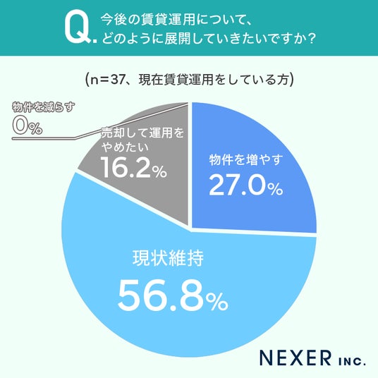 次いで「物件を増やす」が27.0%、「売却して運用をやめたい」が16.2%となりました。「物件を減らす」と回答した人は0%でした。