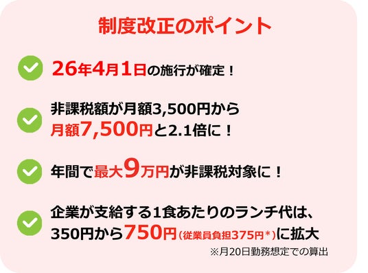 こうした背景を受け、当社は「食事補助上限枠緩和を促進する会」を設立し、要望活動を継続的に実施してきました。その結果、「骨太の方針2025」や税制改正要望に見直しが盛り込まれ、2025年12月の税制改正大綱において非課税上限の引き上げが閣議決定。そして今回、国税庁の通達改正により、2026年4月1日以降の食事補助について、引き上げ後の非課税上限が適用されることとなりました。