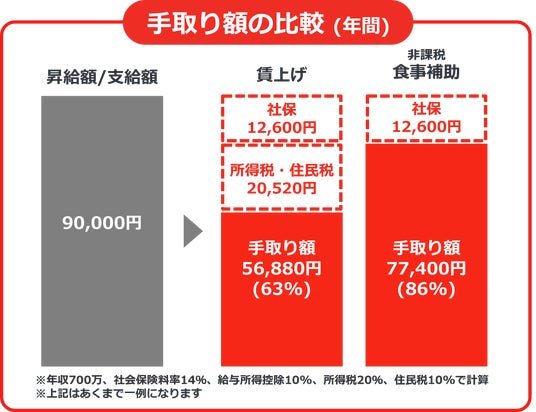 ■【賃上げ vs 食事補助】こんなに変わる!非課税活用で従業員の手取り額アップ
