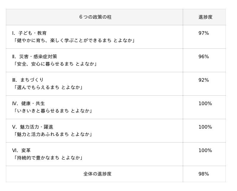 豊中市は、市長の掲げる基本理念「未来につなぐまちづくり~「創る改革」とよなか 夢 みらい~」に基づき、任期中に取り組む基本政策として、70の政策項目からなる6つの政策の柱の進捗状況を毎年度公表します。