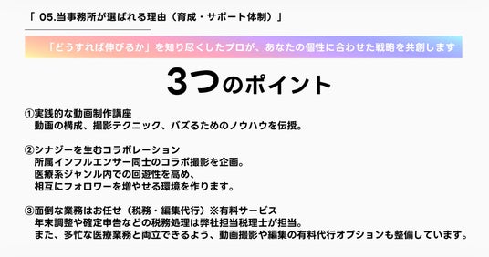 単なる芸能事務所ではなく、専門性の高い情報発信を行う医療従事者と、フォロワー数10万人を超える実績を持つマネージャーたちが協働することにより、正しい医療情報をより多くの方に届けることが可能になります。