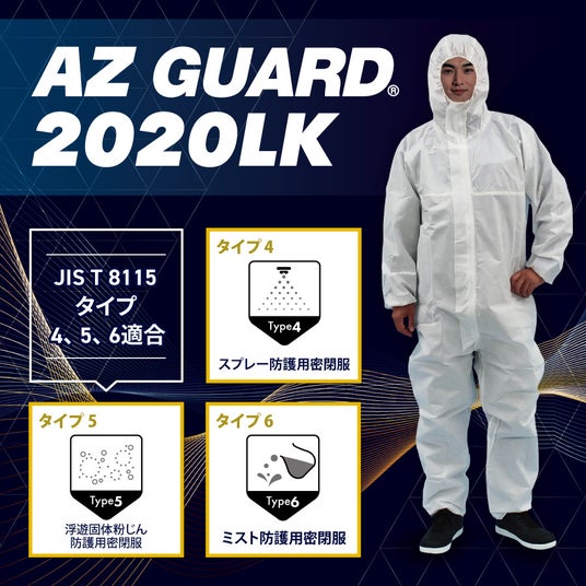 防護服の専門サプライヤー、アゼアス株式会社(本社:東京都台東区、代表取締役社長:斉藤 文明)は、化学防護服の日本産業規格であるJIS T 8115における、タイプ4(スプレー防護用密閉服)、 タイプ5(浮遊固体粉じん防護用密閉服)、タイプ6(ミスト防護用密閉服)に適合した製品として、「AZ GUARD(R) 2020LK 続服」を4月1日より販売開始いたしました。