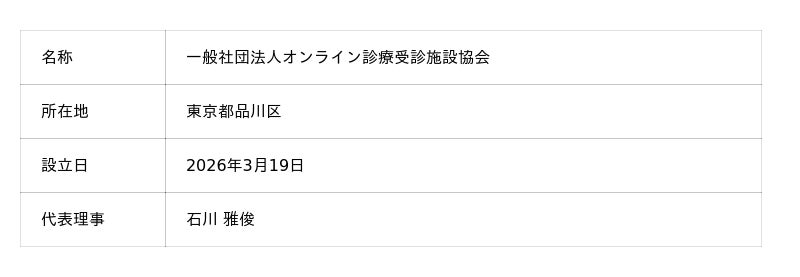 一般社団法人オンライン診療受診施設協会(所在地:東京都品川区、代表理事:石川雅俊)は、2026年4月1日より活動を開始いたしました。