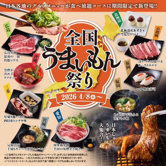 今回は、日本中のご当地メニューをテーマに各地域で親しまれている味が楽しめる全9品をご用意しました。メニューには、「広島名物コウネ」、「気仙沼ホルモン」、「博多もつ鍋」などがラインナップ。単品注文はもちろん、食べ放題「ジャストミートコース」以上をご注文いただくと、対象の「全国うまいもん祭り」メニューをご堪能いただけます。ご家族やご友人とのお食事はもちろん、おひとり様でも気軽に楽しめる、「かみむら牧場」ならではの期間限定企画です。この機会にぜひお立ち寄りください。