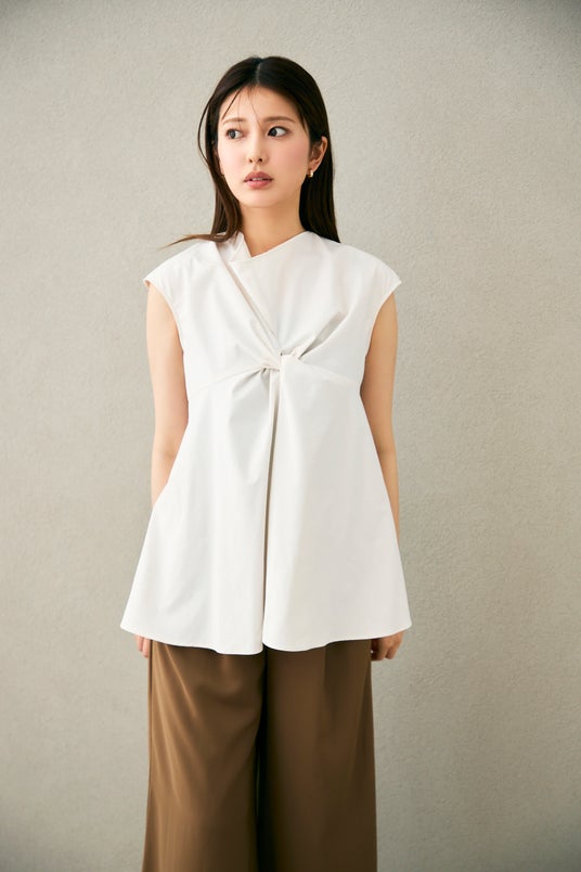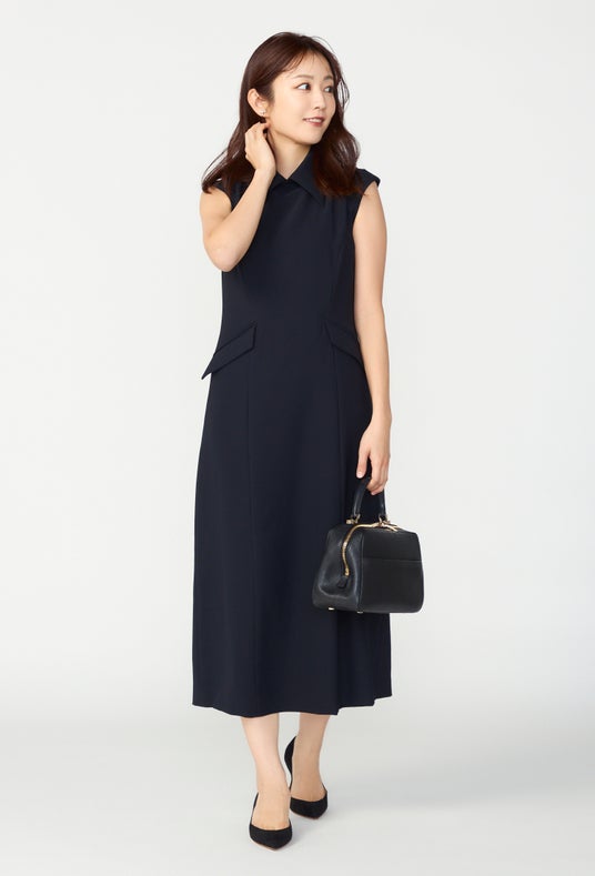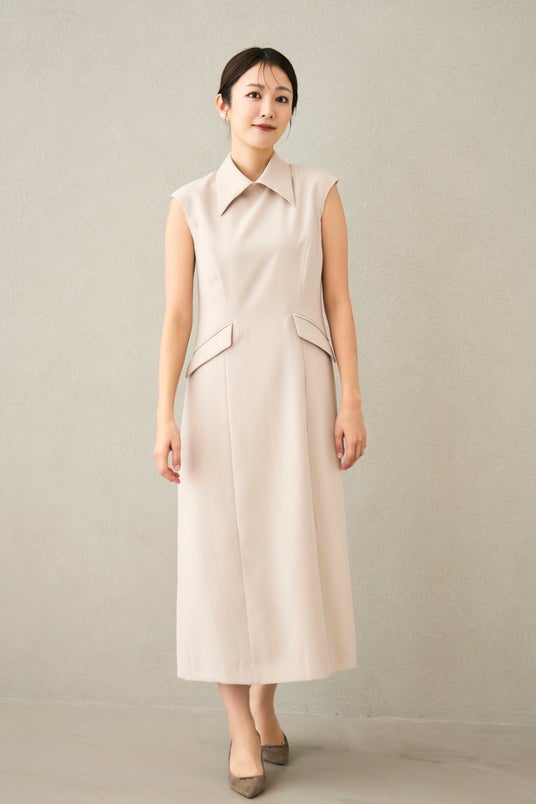 張りのある素材が、装いをきりりと整え肩をそっと包む絶妙なノースリーブで端正な佇まいに。
