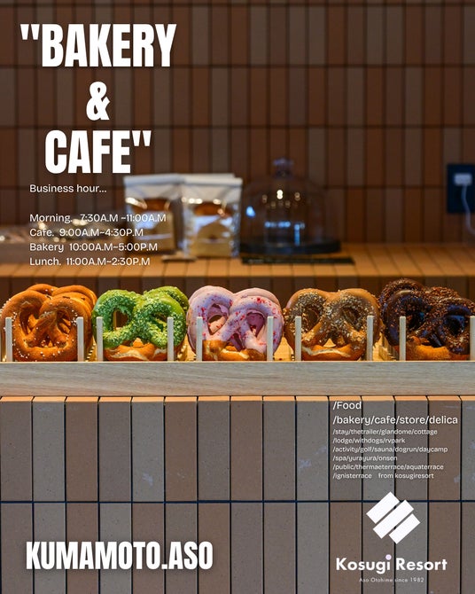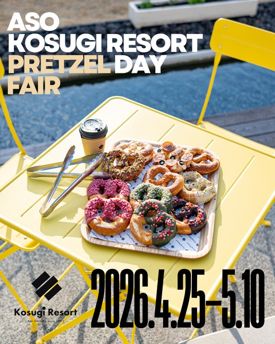 Kosugi Resort/Bakery&Cafeの魅力Kosugi Resort内のBakery&Cafe(ベーカリー&カフェ)では、熊本県南阿蘇で愛された「パンダイゴ」のベーカリーシェフ:上道大吾 氏が手掛ける素材や製法にこだわった商品づくりを行っています。プレッツェルもその代表的な人気商品です。生地から丁寧に仕上げる本格製法により、外は香ばしく中はもっちりとした食感を実現。イベント期間中はこうしたこだわりの味わいをベースにした限定商品も展開し、リゾートならではのグルメ体験を提供します。