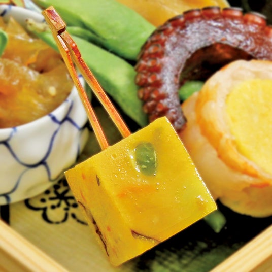 切り出し不要の彩り前菜鶏肉を柚子胡椒と味噌ベースで味付けし、卵黄生地とともに蒸し上げました。柚子胡椒のピリッとした刺激が良いアクセントです。蒸し・カット・串打ちまで行ってあるため、解凍後そのまま前菜の一品としてご使用いただけます。