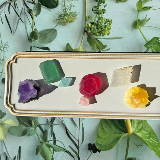 「ルビーちゃんとエメラルドちゃんのこうぶつヲカシ 9粒箱」は、仲良しの姉妹が母の日に贈る特別なプレゼントをイメージした、華やかなギフトセットです。ルビーとエメラルドを中心に、宝石や水晶をイメージしたこうぶつヲカシを詰め合わせ、和紅茶のティーバッグ、やさしく灯る鉱物型ジェルキャンドル、彩りを添えるドライフラワーをセットにしました。箱を開けた瞬間から、まるで宝石箱のようなときめきと、ゆったりとした癒しの時間をお届けします。元気いっぱいで好奇心旺盛な妹ルビーちゃんと、静かに星空や本を楽しむお姉ちゃんエメラルドちゃん。性格はちがっても、ふたりはいつもいっしょ。今年の母の日、「ママにとびきりの贈りものをしよう!」とわくわくしながら選んだのは、宝石のようにきらめくお菓子と、灯りとお花に包まれるやさしい時間でした。ママの笑顔を思い浮かべながら、大切に詰め込んだ想いごと届ける、心あたたまる母の日ギフトです。