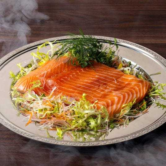 【シェフおすすめの一皿】沖縄県産黒糖でマリネしたノルウェーサーモンの軽い燻製 シークヮーサー香るグリーンペッパーソース