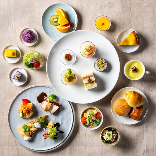 本フェアでは、旬の食材と沖縄の食文化を掛け合わせた、オリジナリティあふれるブッフェが登場します。定番の沖縄料理に新たなアレンジを施した「チキナーチャンプルー ガパオ風」や「タコライスの海苔巻き仕立て」など、伝統と遊び心を融合させた創作沖縄料理が並びます。スイーツにも沖縄の魅力を凝縮した「田芋のチーズケーキ」「黒糖ジーマミーアイス」「紅芋の生絞りモンブラン」など、素材の個性を生かしたラインアップをご用意。ディナーでは、シェフおすすめの一皿として「沖縄県産黒糖でマリネしたノルウェーサーモンの軽い燻製」を提供。やさしい甘みと燻香が調和した、フェアを象徴する逸品です。