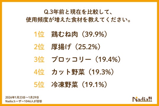 具体的に、使用頻度が増えた食材1位は「鶏むね肉(39.5%)」、2位は「厚揚げ(25.2%)」、3位は「ブロッコリー(19.4%)」となりました。これらは安価で栄養価が高く、ボリュームを出す「かさ増し食材」として支持されており、近年の物価高による節約や栄養面の両立がうかがえます。また、「カット野菜(19.3%)」や「冷凍野菜(19.1%)」の利用増加からは、下処理を省き時間を確保するタイパ意識が表れています。