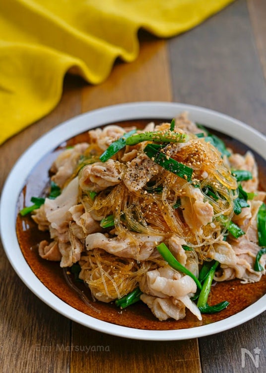 レンジで簡単♪戻し不要♪包丁不要♪コク旨さっぱり!豚ニラ春雨 by松山絵美さん