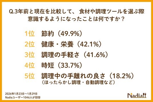 3年前と現在を比較した食材や調理器具を選ぶ際に意識することの変化(複数回答)についても、「節約(49.9%)」が1位で、次いで「健康・栄養(42.1%)」「調理の手軽さ(41.6%)」が上位を占めました。