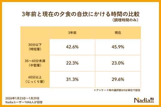 また、調理時間の変化については、30分以内で効率よく済ませる「時短層」が42.6%から45.9%へと増加した一方で、60分以上かけて丁寧に作る「こだわり層」は31.3%から29.6%へと減少しました。