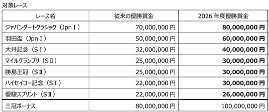 TCKで実施される重賞レースの価値と魅力をさらに高めるため、7競走について優勝賞金を増額します。また3歳ダート三冠は3レースすべてを優勝した際の「三冠ボーナス」の増額を行います。