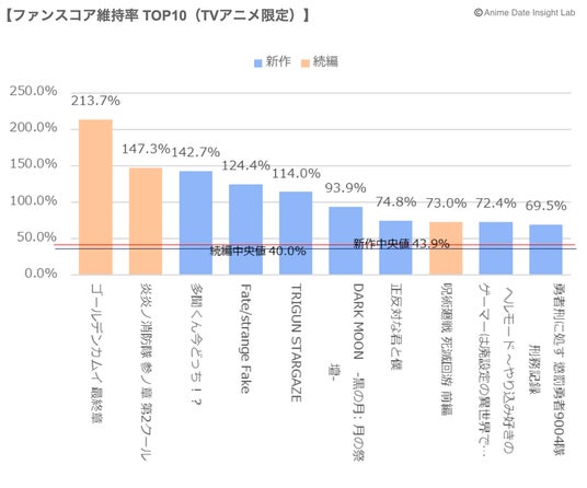 ここで興味深い逆転が起きている。中央値を見ると、新作43.9%に対して続編40.0%。トレンドスコア維持率では続編が新作を上回っていたのに、ファンスコア維持率では新作が逆転した。