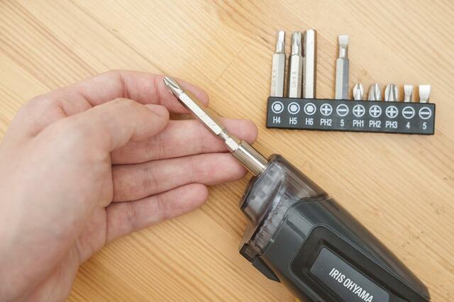 プラス・マイナス・六角と合計10種類のビットが付属しているので、基本的な家具の組み立てで困ることはほぼありません。