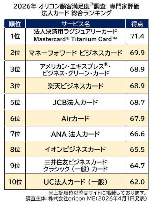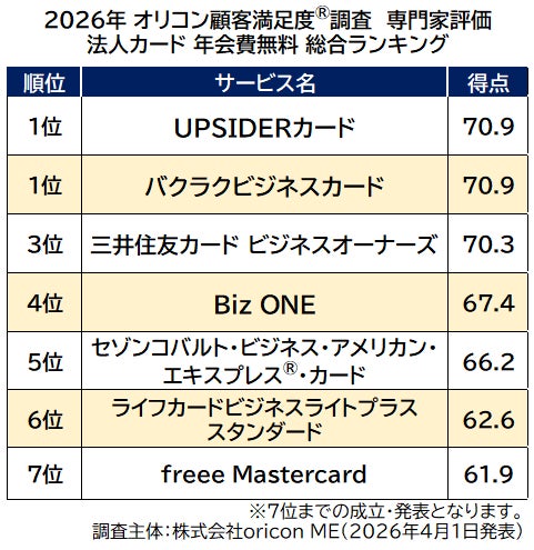 オリコン株式会社(本社:東京都港区 代表取締役社長:小池 恒、略称:オリコン)は、グループ会社である株式会社oricon MEが、金融系の専門家を対象に実施した『法人カード 年会費無料/法人カード/法人カード ゴールド/法人カード プラチナ』の専門家評価の調査結果を、2026年4月1日(水)14時に「オリコン顧客満足度(R)」公式サイト内にて発表いたしました。ランキングの結果は、下記の通りとなりました。