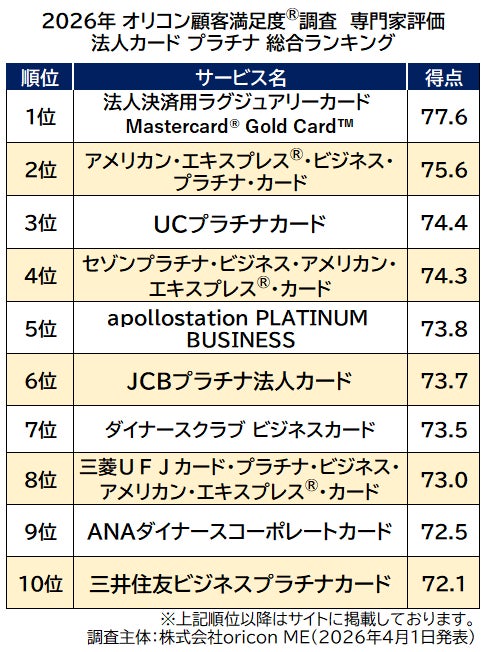 『法人カード プラチナ(専門家評価)』総合ランキング(2026年 オリコン顧客満足度(R)調査)