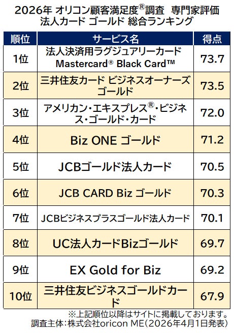 『法人カード ゴールド(専門家評価)』総合ランキング(2026年 オリコン顧客満足度(R)調査)