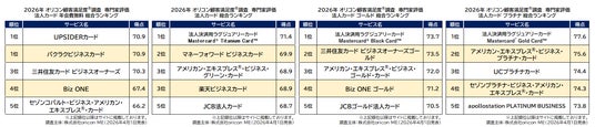 『法人カード(専門家評価)』各総合ランキングの結果(2026年 オリコン顧客満足度(R)調査)