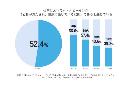 1. 仕事時のウェルビーイングにおいて世代間で大きな差「仕事において『ウェルビーイング(心身が満たされ、健康に働けている状態)』であると感じていますか?」と聞いたところ、「ウェルビーイングであると感じている」割合は全体で52.4%となりました。世代別で見ると20代が66.6%、30代が57.4%、40代が43.6%、50代が39.2%と、Z世代にあたる20代、30代は仕事のシーンでウェルビーイングであると感じている割合が多い一方で、年齢が上がるにつれて低下する傾向が見られ、明確な「世代間の格差」が浮き彫りになっています。