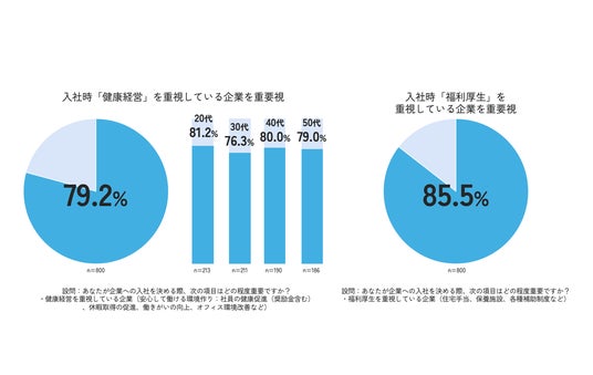企業選びにおいて、全体の79.2%が「健康経営を行っている企業」を重視すると回答。特に20代では8割を超える結果となり、住宅手当をはじめとする福利厚生(85.5%)に迫る結果に。