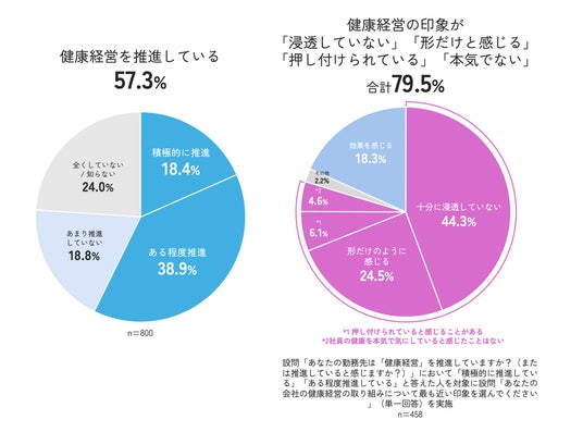 全体の57.3%が「健康経営を行っている企業で働いている」と回答するも、そのうち約8割が「社内に浸透していない」や「形だけのように感じる」等と回答しており、健康経営を謳っているだけの企業もまだまだ多いことがうかがえる結果に。