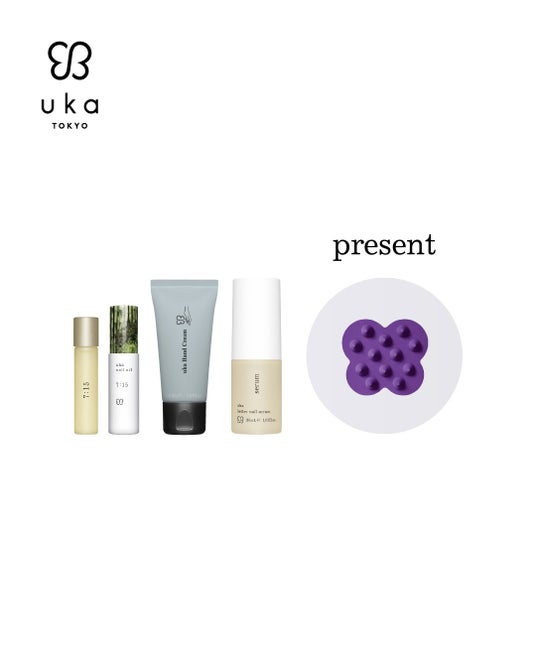 爪と手肌を同時にケアできるネイルオイル・ハンドセラム・ハンドクリームのセットをご用意。シャンプー時にネイルを守るケンザンは、公式店限定のパープル。