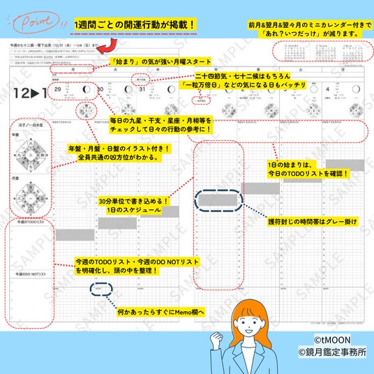 鏡月鑑定事務所の知見をもとに、開運行動を誰でも使える形へと整理した「開運戦略ノート」「開運カレンダー」では、占いを単なる“結果を知るもの”ではなく、日々の意思決定をスムーズにするための客観的なデータとして活用し、あなたの行動を強力に後押しします。