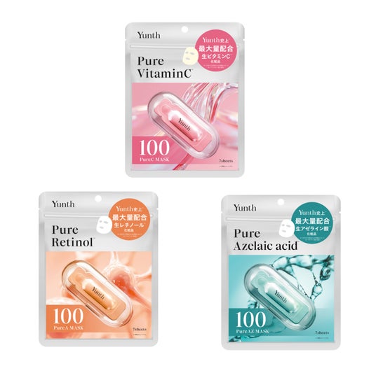 Yunthブランド史上最大量*の美容成分を配合したシートマスクシリーズ。全3種のラインナップで、肌悩みに合わせた集中ケアをデイリーに提案します。