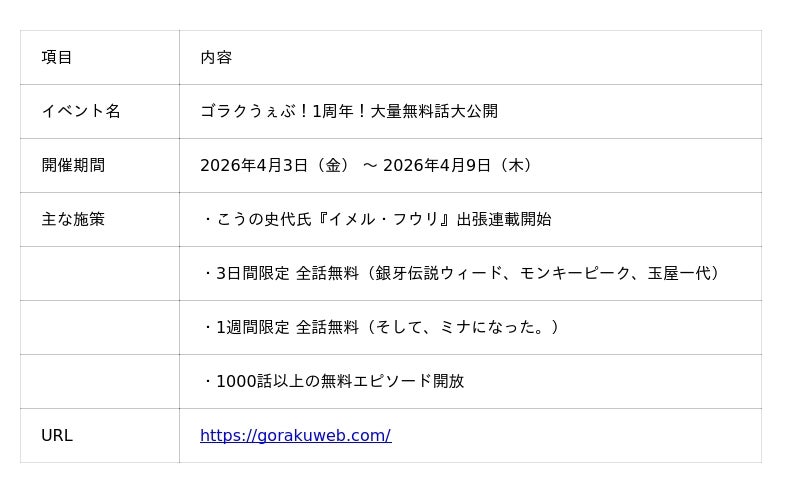 株式会社日本文芸社(東京都千代田区)が運営する公式Webマンガサイト「ゴラクうぇぶ!」(https://gorakuweb.com/)は、2026年3月末にサービス開始1周年を迎えました。これを記念し、2026年4月3日(金)より、超豪華な「“ゴラクうぇぶ!”1周年!大量無料話大公開」フェアを開催いたします。