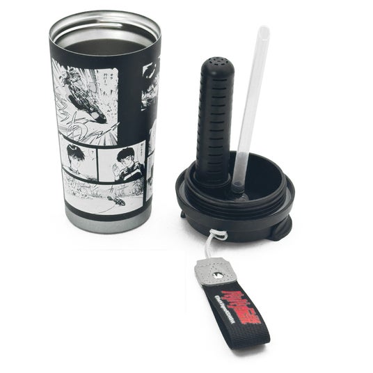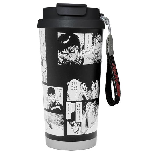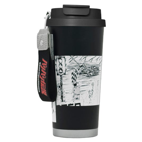 タンブラー本体には、『バリバリ伝説』の名場面をぐるりと一周配置。コミックのコマ割りやキャラクターの表情、疾走感あふれるシーンをそのまま落とし込み、持つだけで作品世界に浸れるデザインに仕上げました。モノトーンを基調とした配色とマットな質感のステンレスボディが、作品の熱量と大人の落ち着きを両立させています。