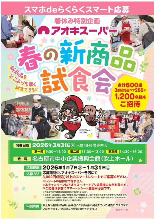 株式会社アオキスーパーは、2026年3月31日(火)、抽選で当選されたアプリ会員様(600組1,200名様+小学生以下は何名でも可)をご招待し、春休み特別企画『春の新商品試食会2026』を開催いたしました。本企画は、昨年3月に初めて開催し、大好評を博したことから、出展社数を56社(66品)から64社(70品)に拡充し、ご招待人数も前年の2倍へと拡大しております。