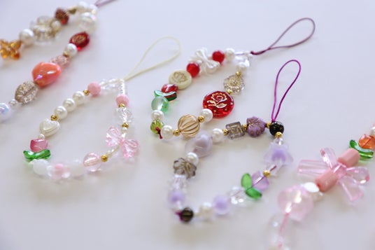 フラワービーズストラップ作りお好きなビーズを組み合わせてオリジナルストラップを作れます。チューリップ型やカラフルなお花、リボンなどさまざまな形のビーズをとりそろえています。