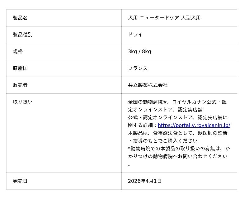 ※1 共立製薬株式会社より動物病院向けに発売中。ロイヤルカナン公式・認定オンラインストアおよび認定実店舗にて4月6日発売開始。