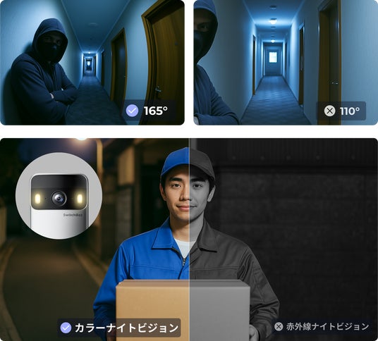昼も夜も、来訪者をしっかり確認スマホ画面からは300万画素の高解像度で映像が確認でき、来訪者の表情や玄関先の様子までくっきり確認可能。また、165°の広角レンズで、玄関前の広い範囲をカバー。2つのLEDライトを搭載しており、夜間でもフルカラーの映像を映すことができます。
