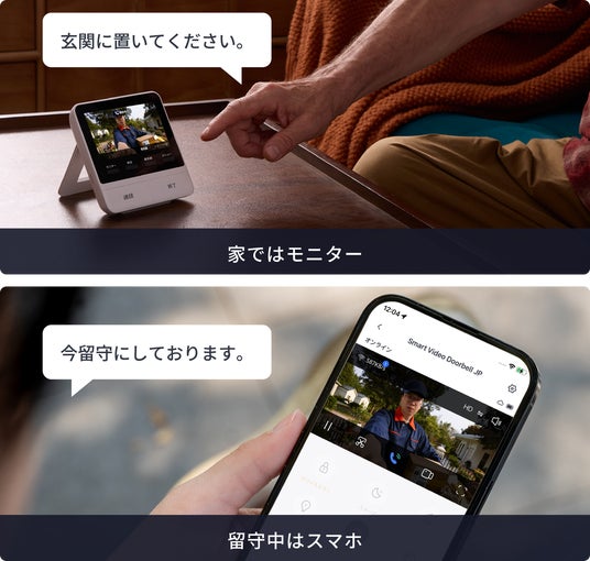 どちらでも来客対応家にいるときはモニター親機から、外出中はスマートフォンから、映像確認と双方向通話による来客対応が可能です。宅配便への応対や、留守中の訪問確認など、居場所に縛られず対応ができるため、日常の利便性が大きく向上します。