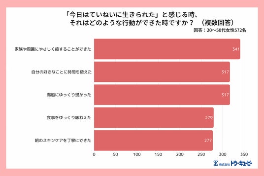 「家族や周囲にやさしく接することができた」(59.6%)が最多。次いで「自分の好きなことに時間を使えた」(55.4%)、「湯船にゆっくり浸かった」(55.4%)、「朝のスキンケアを丁寧にできた」(48.4%)が続きました。