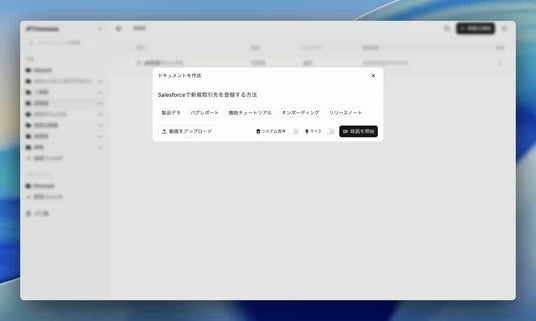 1. 画面録画だけでマニュアルを自動生成PC上の業務操作を録画するだけで、AIが操作のステップを自動で検出・分割し、各手順のスクリーンショットと説明文を自動生成します。録画ボタンを押して普段どおりに作業するだけで、数分後には編集可能なマニュアルが完成します。