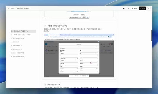 AIが操作の文脈を理解し、手順の構成を自動で整理します。単なる操作ログの羅列ではなく、読み手にとってわかりやすい構成・表現でマニュアルを生成するため、作成後の編集工数も最小限に抑えられます。
