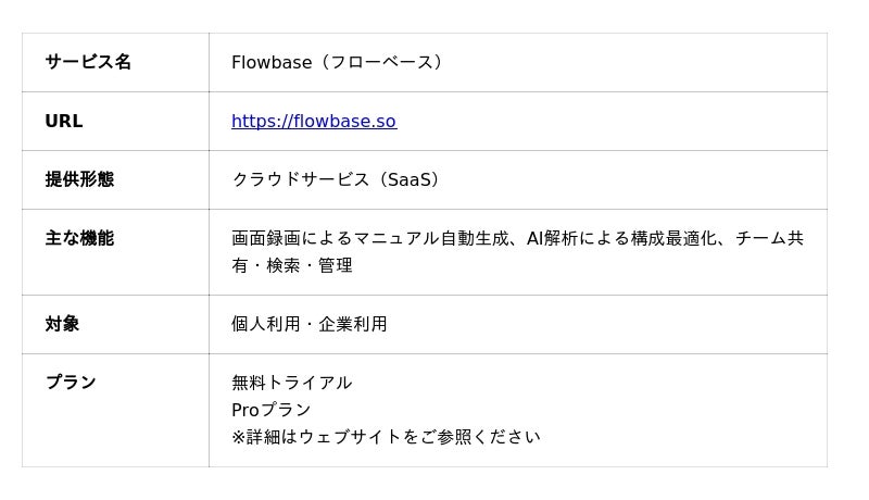 株式会社LR(本社:東京都渋谷区、代表取締役:路 承融)は、業務の画面録画からAIがマニュアルを自動生成するクラウドサービス「Flowbase(フローベース)」を正式リリースいたしました。Flowbaseは、PC上の業務操作を録画するだけで、AIが操作手順を自動解析し、スクリーンショット付きのステップ・バイ・ステップのマニュアルを生成します。マニュアル作成にかかる工数を大幅に削減し、企業の業務属人化の解消を支援します。