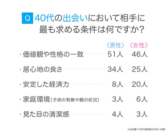 3.40代が最も重視するのは「価値観や性格の一致」(40代独身男女:200人)