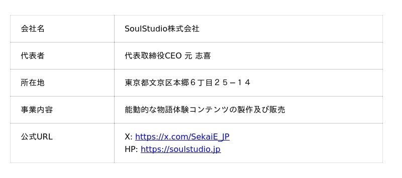 SoulStudio(旧セカイヘ)は「作品世界を生きられる未来を創る」というビジョンのもと、受け手が作品世界の住民となって能動的に物語を体験できるコンテンツを製作する会社です。2023年9月に設立された東大発スタートアップです。複数のアニメ作品におけるSoulChatコンテンツを製作し、提供しています。LINEスタンプを介して作品世界と物々交換を行うチャットコンテンツは、業界初の試みとなります(2026年2月時点、弊社独自調査)。
