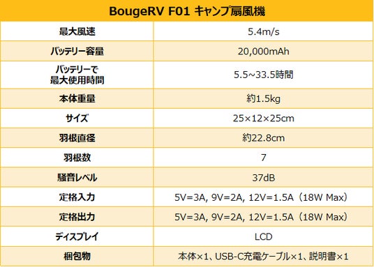 「BougeRV F01キャンプ扇風機」は、昨年発売の「BougeRVサーキュレーター」をベースに、細部の仕様を見直したキャンプ向け扇風機です。ユーザーの皆様から寄せられたご意見を反映し、従来モデルでご好評いただいていた特長はそのままに、使い勝手を中心に細やかな改良を施しました。アウトドアシーンでも心地よい風を届け、暑さによる負担を軽減するなど、熱中症対策にも配慮した一台です。