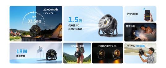 1.夏のキャンプをもっと快適に 最大風速5.4m/sを実現し、他社製品と比べて約1.5倍のパワフルな送風性能を誇ります。暑い日でもしっかり涼しさを届け、快適な空間をキープします。