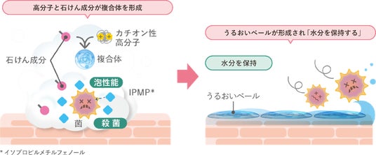 洗い流す時、石けん成分と保湿成分であるカチオン性高分子が肌に吸着しやすい形(保湿成分複合体)に変化します。この保湿成分複合体である「うるおいベール」が、手洗い後の肌に吸着します。しっかり殺菌・清浄しつつ手洗い後もうるおいがとどまることで、しっとり手肌へ導きます。