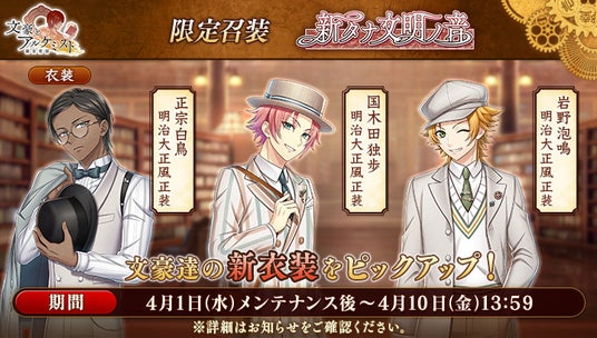 文豪の「衣装」や、会派に装備する事で能力を強化できる「装像」などが入手できるコンテンツ「召装」に、限定召装『新タナ文明ノ音』が期間限定で登場します。この召装では、「正宗白鳥」「国木田独歩」「岩野泡鳴」の新衣装〈明治大正風正装〉を一定の確率で入手できます。